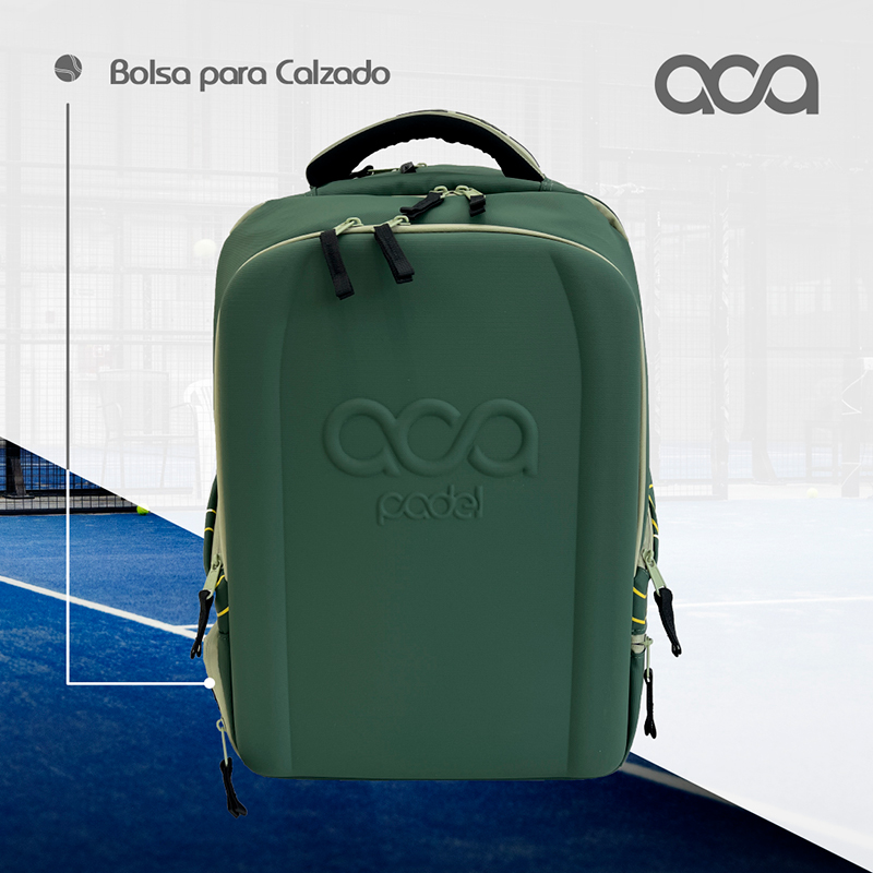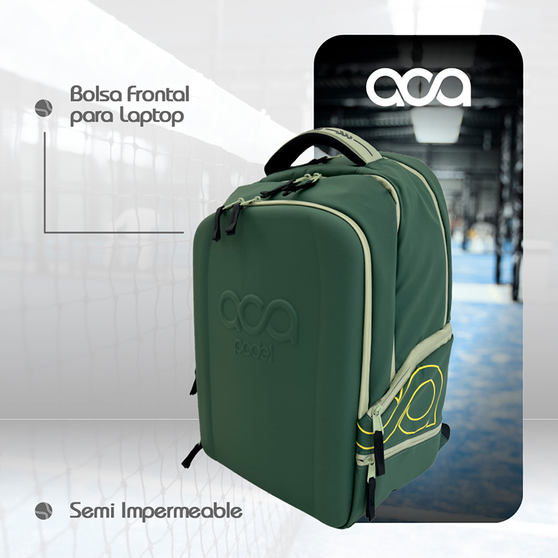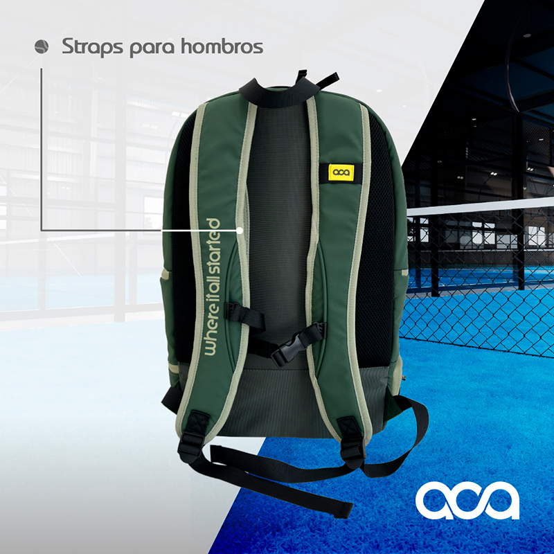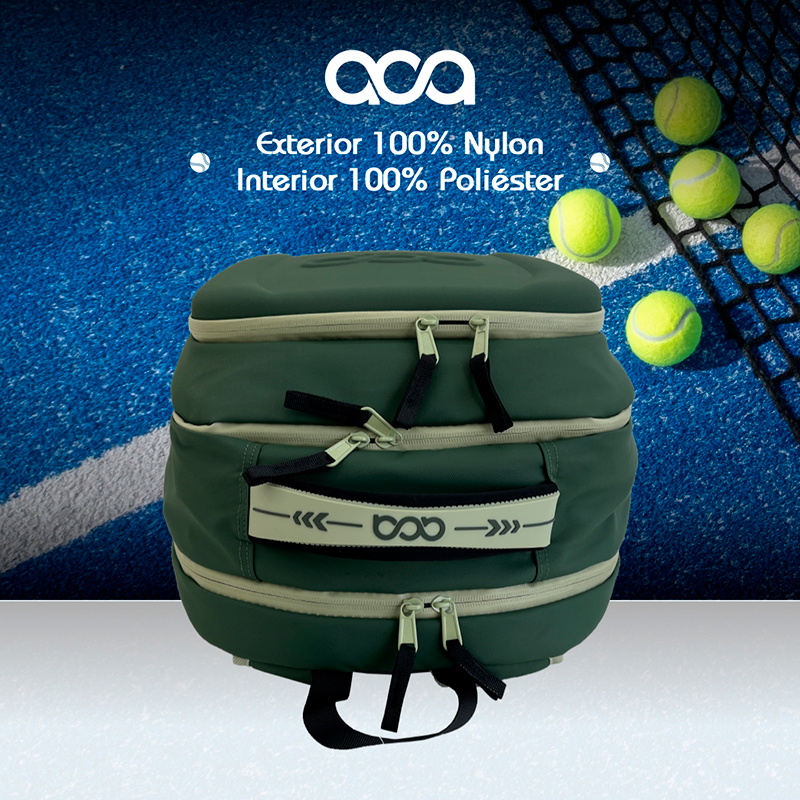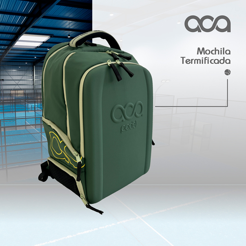 Un Mochila back pack termificada con compartimiento suficientemente grande para dos Palas, compartimento central para ropa, bolas etc, espacio dedicado a tus zapatos o ropa sucia y un compartimento frontal con tapa dura para que lleves tu Lap, artículos personales etc… los Materiales son Polyester plastificado y cierre herméticos que la vuelven prácticamente impermeable.