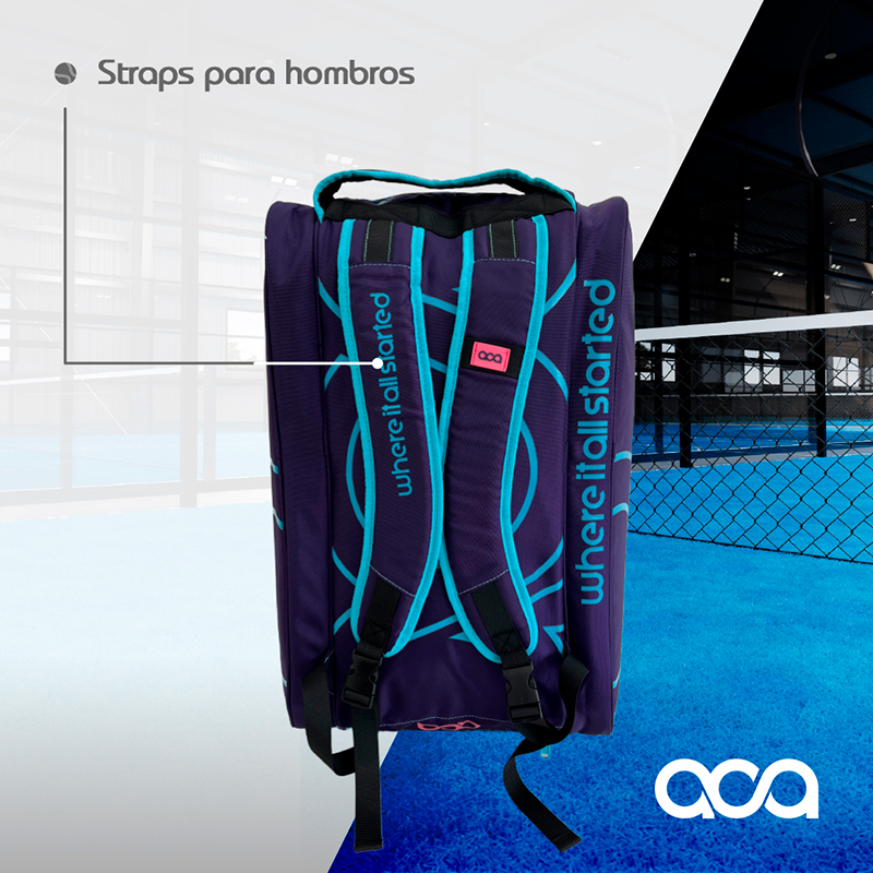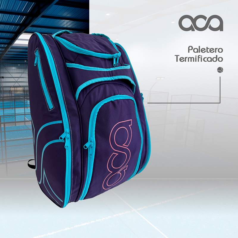 Un Paletero Termificado de gran capacidad con dos compartimentos dedicados a palas, otro para Zapatos o ropa sucia, y otros 3 para artículos personales, así como un gran compartimento central con capacidad hasta para 8 palas o todo lo que quieras meter, straps para hombros y llena de detalles por todos lados.